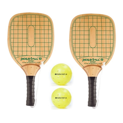 Set includes two Swinger Wood Paddles and two Dura Outdoor balls