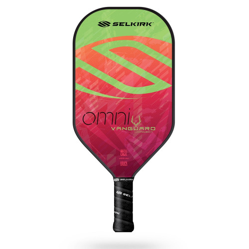 The VANGUARD Hybrid Omni Paddle has the longest face in the VANGUARD line so players can cover the entire court and pull off unexpected maneuvers. The elongated style is ideal for advanced players who can swing with precision but still want a large surface area and crave the increased power, reach and forward momentum this style provides. It comes with a host of improvements over the previous AMPED line including a new type of face, high traction grip and slimmer edge guard.The VANGUARD Hybrid Omni Paddle has a 7.5 – 7.9 oz weight range in the light model and 7.8 – 8.3 oz range in the standard model. Its face is made up of two layers of Toray carbon fiber on both sides which creates exceptional consistency and sensitive touch. The X5 poly core is thick enough to absorb vibrations and prevents stress to the joints. At 4-1/4” long, the handle can be used normally but players can also put their index finger on the back of the face for increased stability. It has a medium grip circumference.