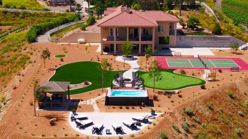 Temecula, CA - This absolutely gorgeous Temecula Hilltop Luxury Home not only features a permanent pickleball court, but a 12-person swim spa, putting green, fire pit, its own vineyard, and picturesque views from atop its 9-acre property! Four bedrooms and three bathrooms accommodate up to 12 guests in style. Opportunities to explore nearby wineries, breweries, historic Old Town, horseback riding, and much more await you. Don't miss this one!